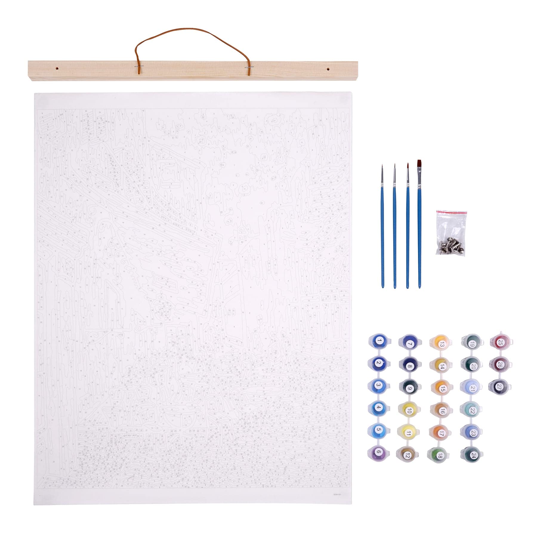 - 16 x 20 (40.6cm x 50.8cm) pre-printed canvas sheet. 8.5 x 11 (21.5cm x 27.9cm) printed picture of final painting. Includes 45 pieces. Degree of difficulty: Intermediate. Vertical. Wood, metal, cotton canvas. Conforms to ASTM D-4236. 2,350 numbered sections. 27 acrylic numbered paint pots. 4 synthetic bristle brushes (2 detail brushes, 1 small round brush and 1 small flat brush). Instruction sheet. Reference sheet. Wooden display hanger consists of 4 wooden rods with pre-drilled.