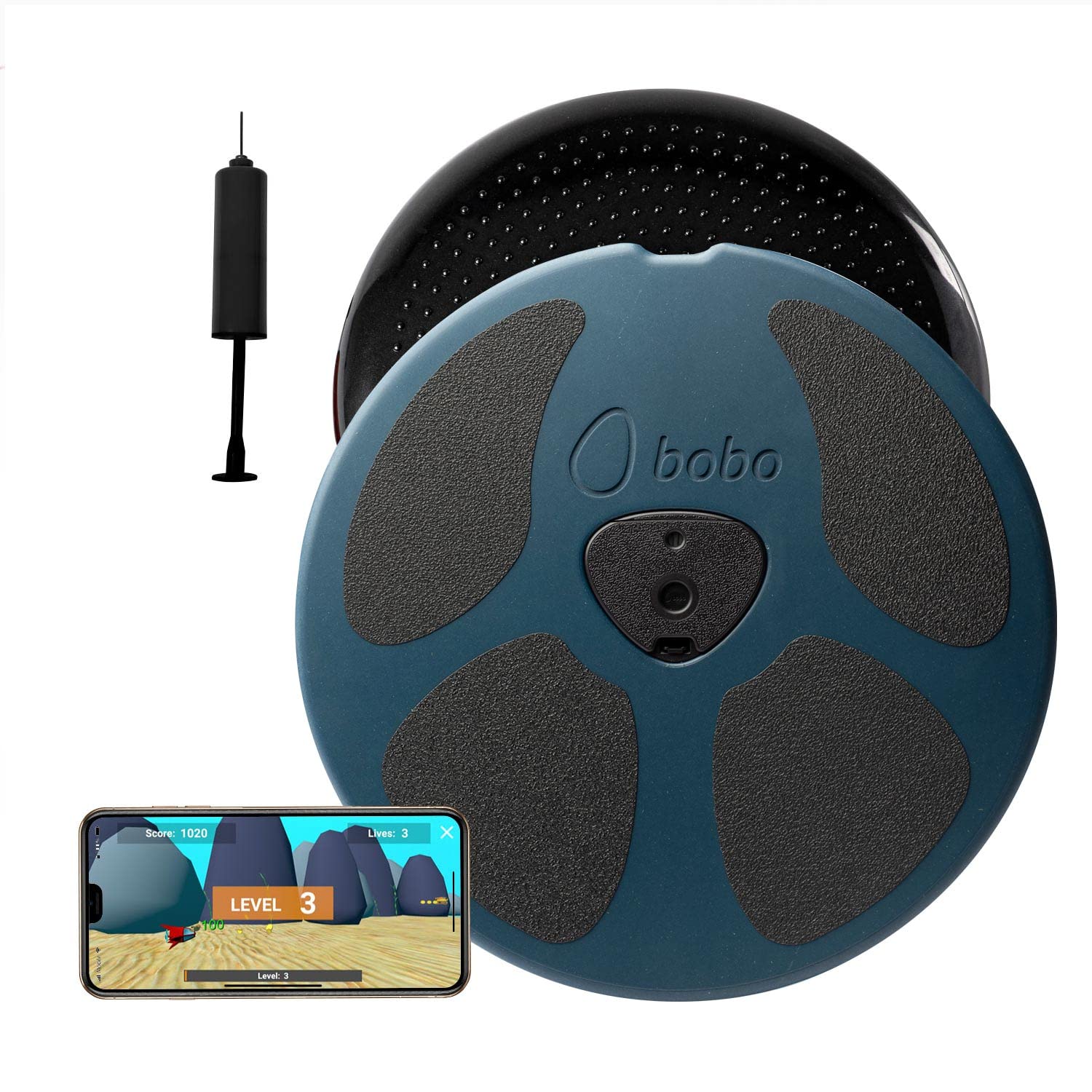 Screen time has never been so fun with this interactive smart connected balance board! Parents, kids, and grandparents can choose their fitness location. Any age or ability will love every moment of training. Physiotherapist developed, the app tracks progress for real results as you stretch & strengthen your body. ENGAGING - Games, apps, and personalized profiles deliver a customized user experience. BALANCE SENSORS - Built in sensors send instant readings from your board to your screen. FOR EVERYONE- Individualized profiles let each user take this to their favorite spot. STRENGTH & FLEXIBILITY - Boost stability, movement, reaction time, and core strength. FAMILY - Designed for ALL ages, this balance board keeps kids on their toes! Meant for kids, seniors, and everyone in between. GO ANYWHERE - Use at home, in the office, or at your friend’s house. This balance board goes anywhere you need. LIGHTWEIGHT - At only 3lbs, the Bobo light board is easy to move. Quickly bring it out for instant use, then hide away when done. LANGUAGES - Supports English, Italian, Chinese, Greek, French, Spanish, Flemish, Dutch, Japanese, & Korean. PLUG N’ PLAY - Turn it on and go! Works on any iOS or Android connected phone or tablet. Long battery life lets you turn it on and start playing! Turn your balance workout into an interactive game! Designed by two Physiotherapists who wanted to create the next generation of workout balance boards. The whole family can get in better shape with a big smile! Package includes: BoBo board Balance cushion Charging cable An air pump
