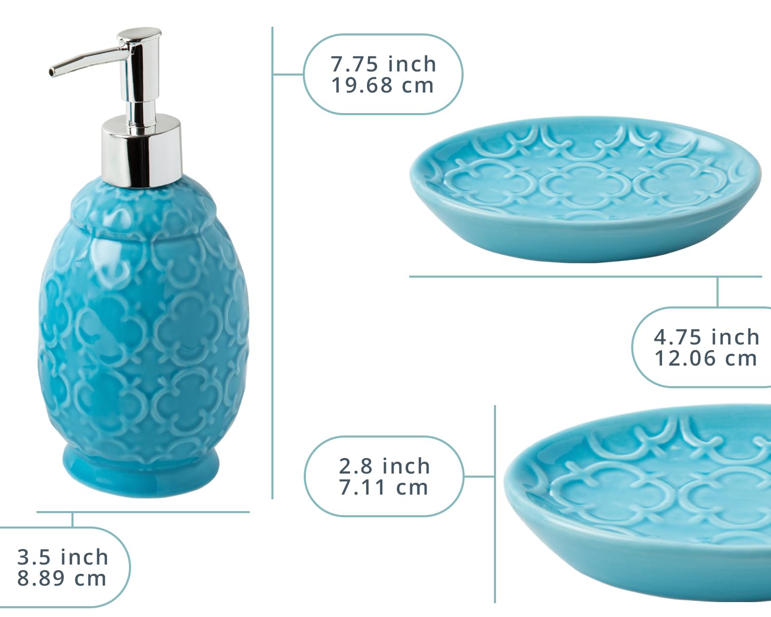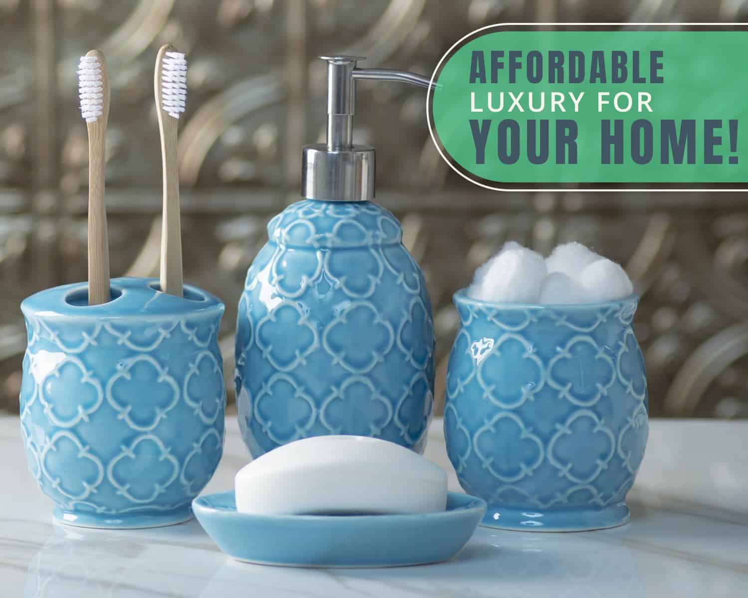 - Luxurious, Embossed Details: Crafted with fine, embossed details, this bathroom decor set is not only eye-candy but also provides a unique sensation every time youll reach for your toothbrush in the morning.