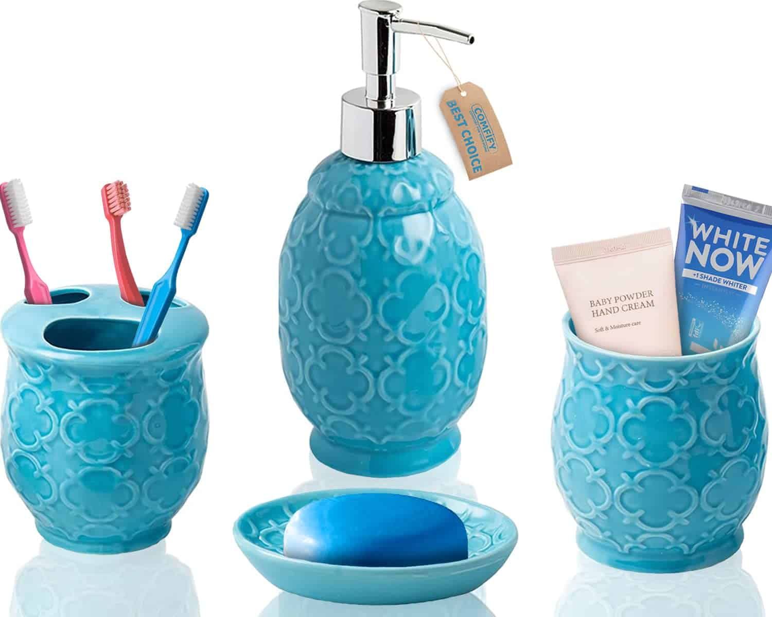 Our Designer 4-Piece Ceramic Bath Ensemble Accessory Set by Comfify includes everything needed to outfit a bathroom for yourself or guests: liquid soap/lotion dispenser, toothbrush caddy, tumbler, and soap dish. Impressive selection of colors and styles fit any bathroom décor. To create the perfect match for your home bathroom décor, first choose your color: - Alpine White - Contour Grey - Turquois Blue Each one is hue designed to complement a wide range of palettes, for ultimate décor versatility. Styles are elegant, with rich textured surfaces and fine details that create an immediate impression. Superior Quality Materials and Metal Soap Dispenser Pump Our sturdy metal soap dispenser pump is designed to last without breaking, leaking, or causing a mess. Check other listings carefully and avoid cheap plastic bathroom sets and flimsy pumps! Our strong metal pump is designed to last for years. Spruce Up Your Bathroom or Give the Perfect Home Gift This 4-piece bathroom décor set is a best-seller as a house warming gift, wedding present, or gift for anyone who wants to create an attractive look for their bathroom. Whether you purchase for yourself or someone special, this home bathroom accessory is a wonderful choice!
