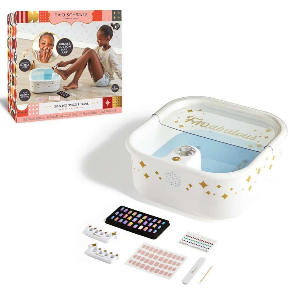 Make everyday a spa day with the Mani Pedi Spa Set from F.A.O. Schwarz?. Relax and enjoy a rejuvenating foot bath with bubble jets and included foot soak packets. Complete the experience with built-in LED lights and sounds for a full spa-like experience. After soaking in the tub, use the included accessories to clean and decorate your nails in variety of fun and exciting ways. Follow the instructions and place nail wraps, press-on nails, and nail gems in an endless amount of crazy combinations for eye-popping nail designs.