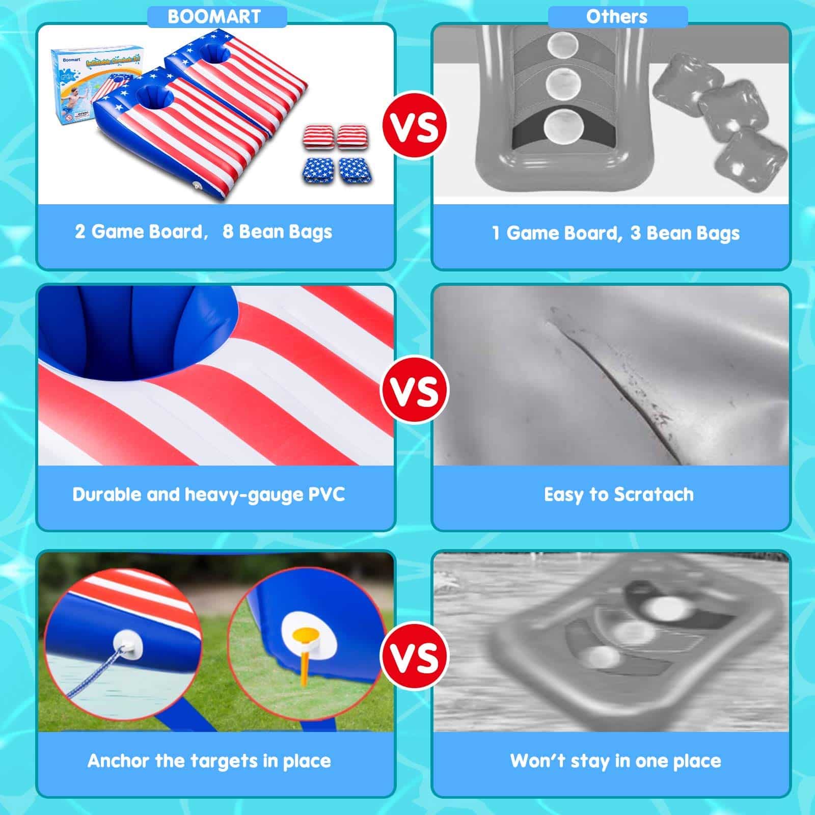 There are grommets on all 4 corners for tethering on land or in the water to keep cornhole board in one place.