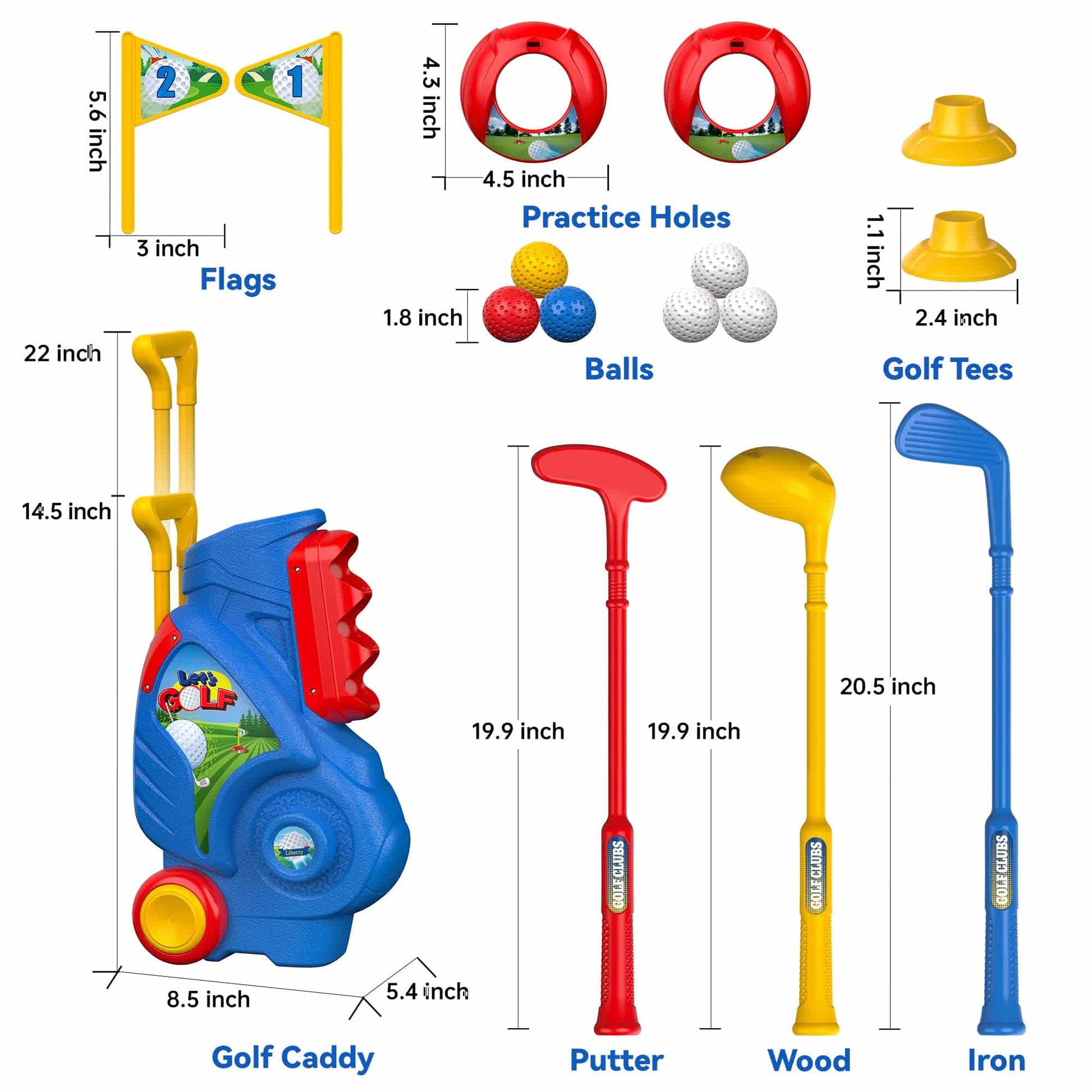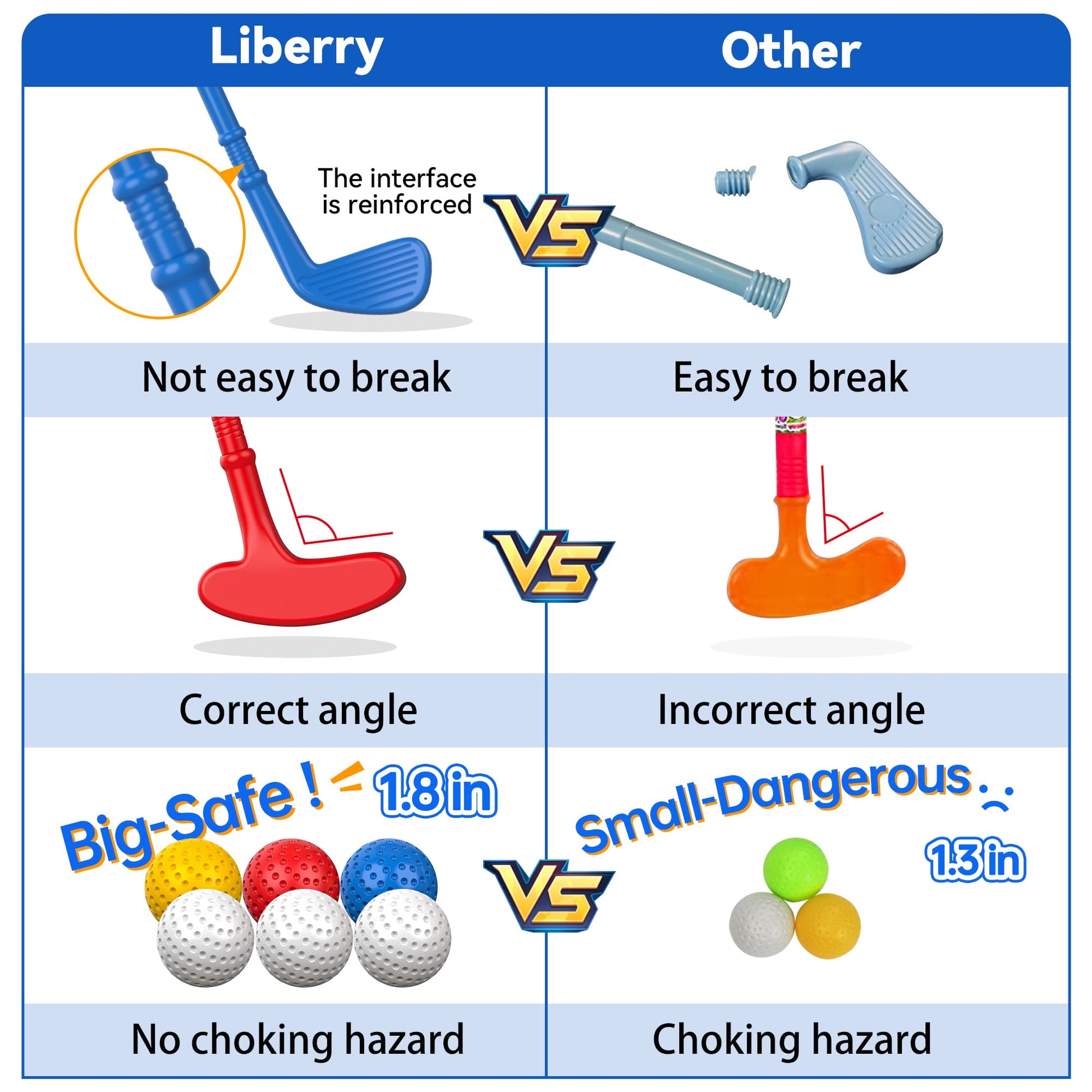 - Safe and Durable: The latest version of Liberry's kids' golf set is produced with odorless and non-toxic high-quality plastic. The toddler golf set does not include any parts or edges that are jagged or pointed. The hardness of the club is enhanced, and it is not easy to break. Because our golf balls are larger (1.8 inches in diameter), it can effectively avoid choking hazards