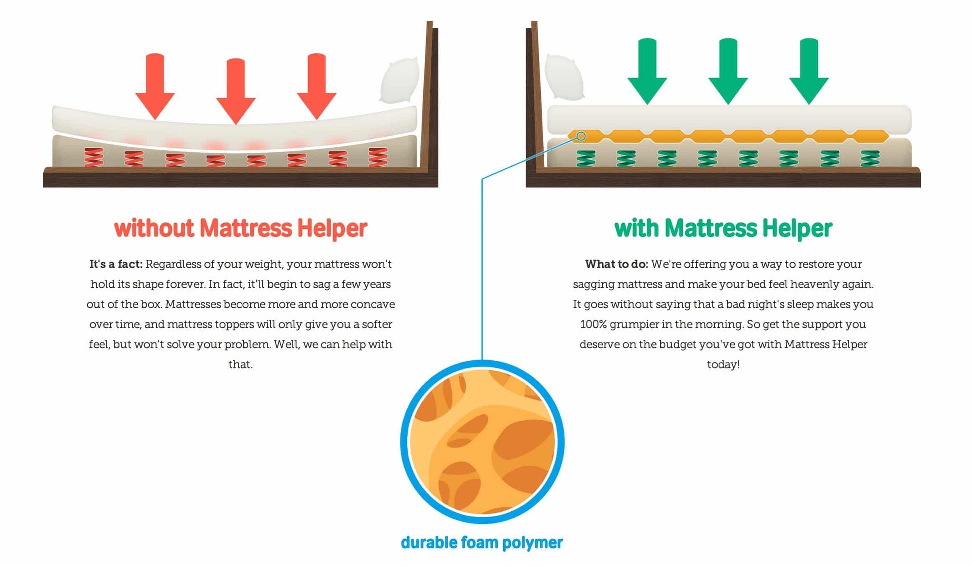 - SEE FOR YOURSELF why MATTRESS HELPER is a large National Brand selling to 100's of Thousands of happy sleepers over the past 10 years! Our Multi-Patented Product has NEVER COMPROMISED on the Durable High Density Foam materials we use so that we can continue to offer the same reliable Under Mattress Support that our customers love!