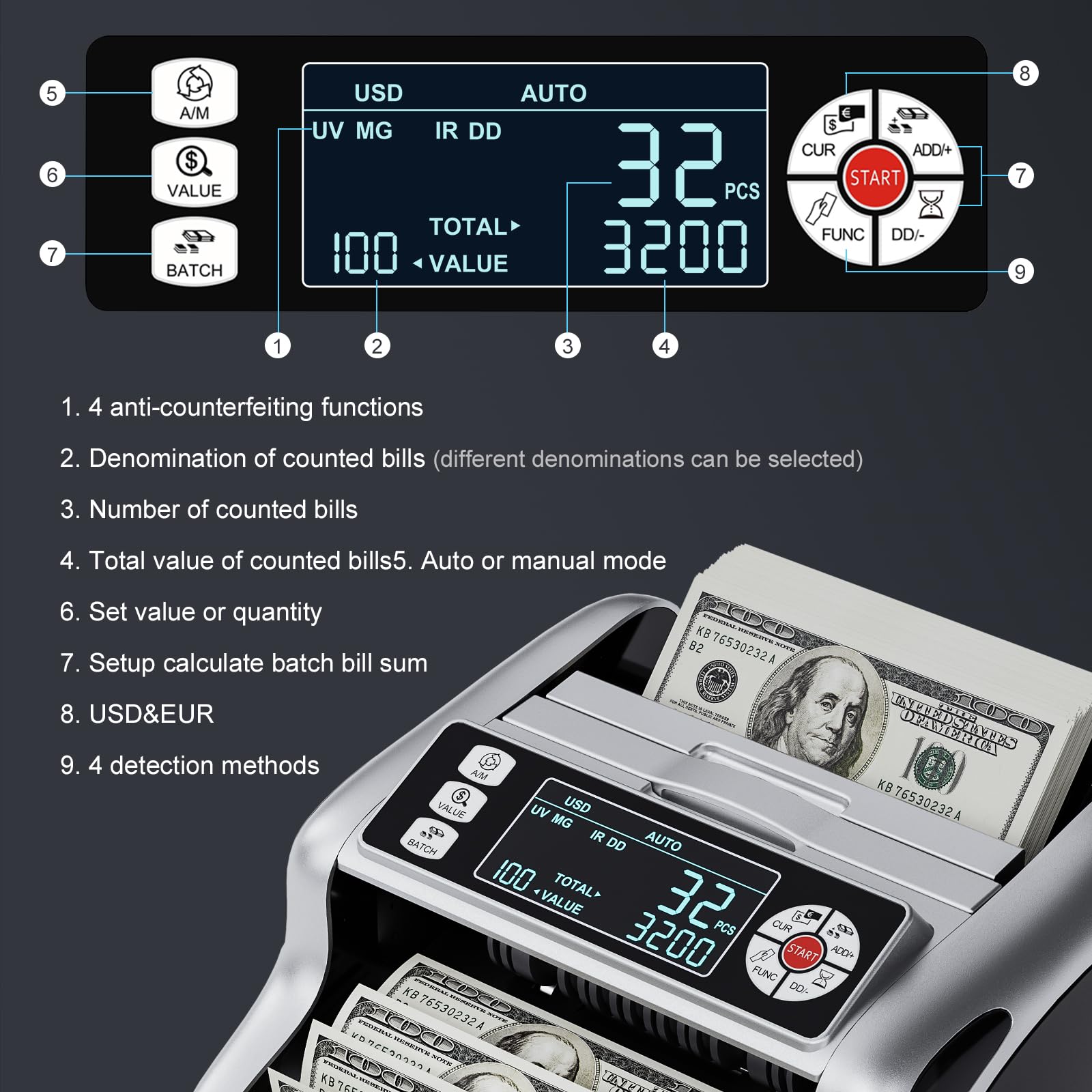 - Professional & Precise DetectionDollar/EUR cash counter has 4 high-tech bill detectors to detect all kinds of counterfeit bills - Ultraviolet (UV), Infrared (IR), Magnetic Wave (MG), and Dimensional Detection (DD). If counterfeit bills, consecutive bills, double bills, or half bills are detected, the screen will turn red and an alarm will sound. You can use these four detection methods together or individually, in order to get more accurate detection results.