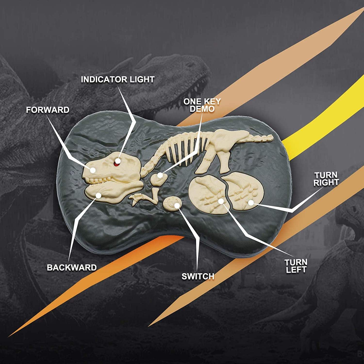 - EASY-TO-USE CONTROLS: The large and colorful fossil-shaped remote control is easy for children to hold and use. They can control the dinosaur toy's movements with the simple forward, backward, left, and right buttons.