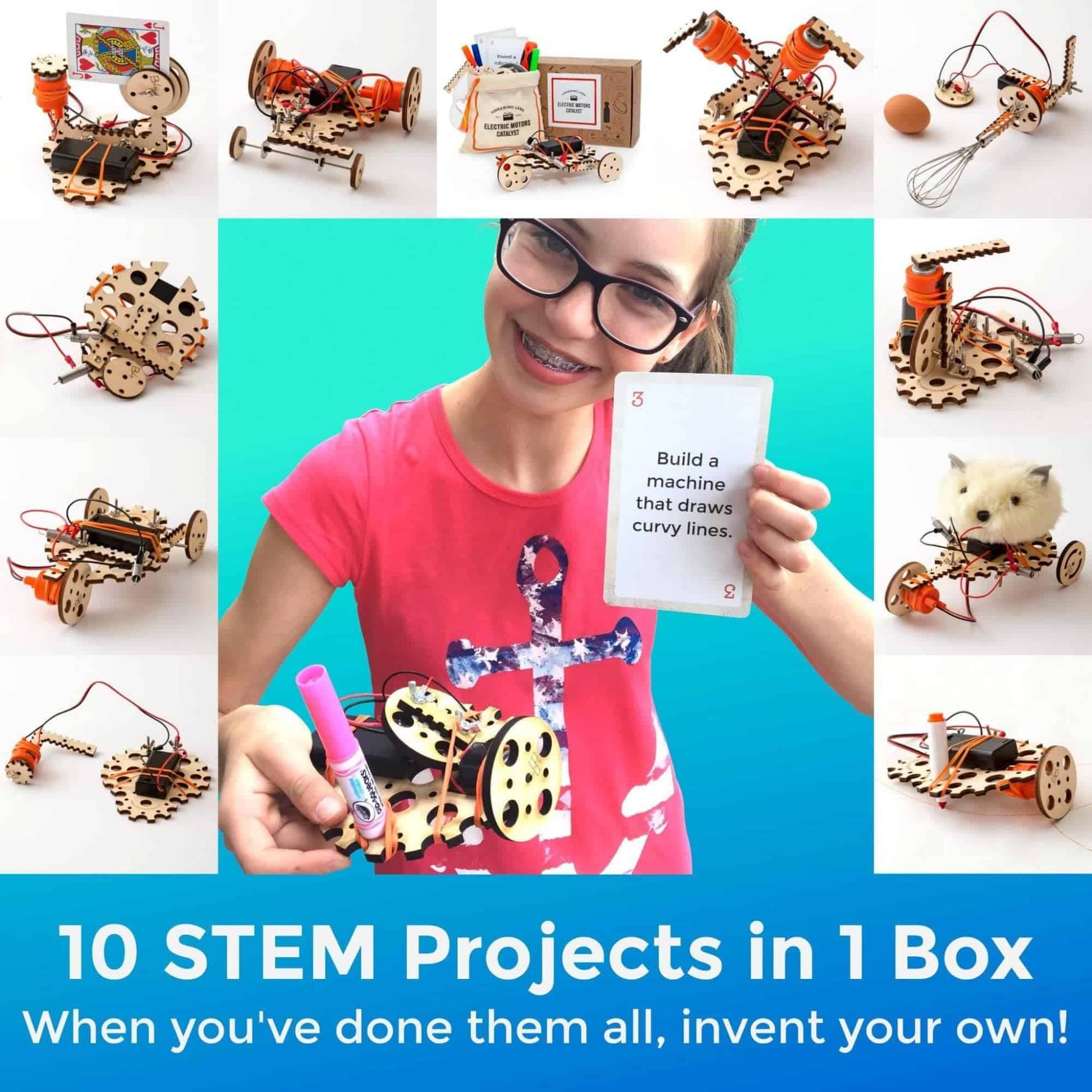 - 10 ENGAGING PROJECTS IN 1 BOX Over 50 premium components, including electric motors, wood parts, and real hardware, provide 10 Challenges that spark young inventors' imaginations. With everyday and mysterious pieces, the kit triggers creativity, boosts IQ, and instills a deeper understanding of STEM concepts.
