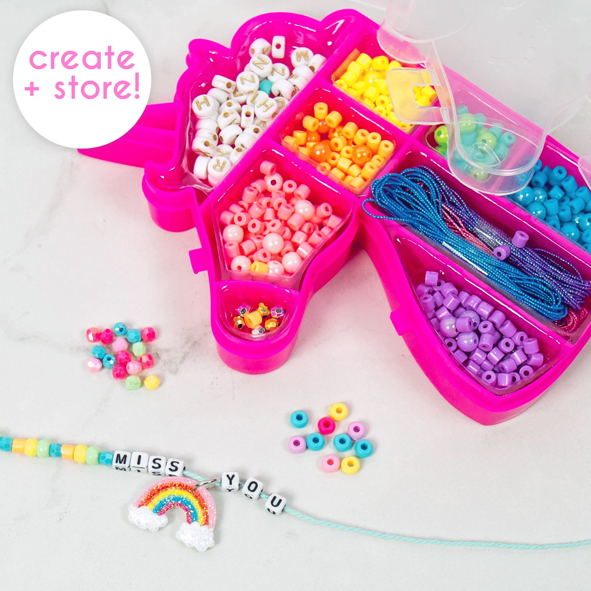 - Kit Includes: 1 Unicorn Jewelry Case, 100 Round Faceted Beads (Mix of Blue, Green, Pink, Purple, Yellow), 625 Round Beads (Mix of Blue, Green, Pink, Purple, Yellow, Orange, Light Pink), 20 Pearl Beads, 70 Plastic E Beads (Mix of blue, Green, Pink, Purple, Yellow), 10 Skeins of Friendship Thread (Purple, Lime Green, White, Dark Pink, Orange, Teal, Turquoise, Yellow, Light Pink) 8.75 yds. Each, 2 Elastic Cords (1 yd. Each), 1 Metallic Elastic Cord, 80 Round Metallic Beads (Silver, Gold), 1 Unicorn Pendant with Jump Ring, 90 Cubed Alphabet Beads (White with Black Letters), 1 Rubber Heart Pop Bead, 3 Sparkling Elastic Cords (Blue, Pink, Purple) 3 yds. Each, 1 Glitter Rainbow Charm, 300 Seed Beads (Mix of Blue, Orange, Pink, Purple, Turquoise, Yellow), 65 Round Alphabet Beads (White with Gold Letters), Easy-to-Follow Instructions