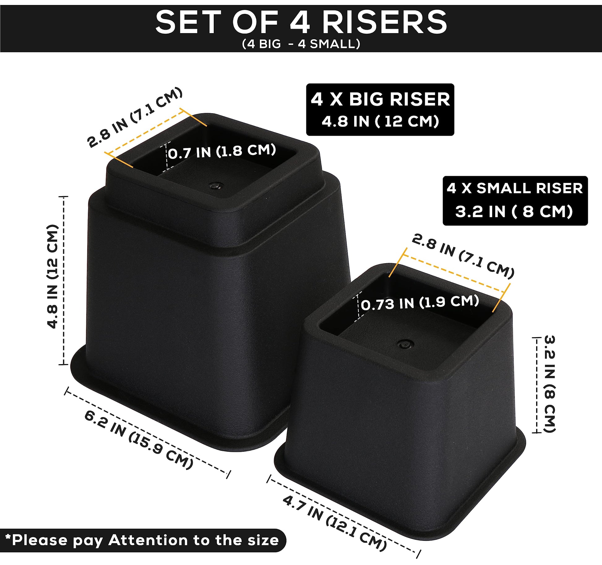- The Set of 4 risers (4 Large & 4 Small = Total 8 piece), ranging from 3 to 8 inches in height, add a new level of comfort in your life. The risers are 2.8 inches wide and 0.7-inch in depth, giving a strong base for furniture legs.